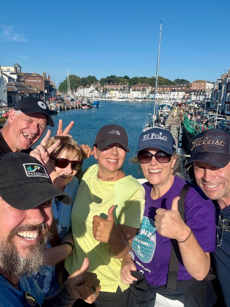 We set off just before 8am, thinking the stroll down to the Isle of Portland would be a gentle warm-up – maybe 3 miles at most. Turns out it was closer to 4.5 miles… classic misjudgement 😅. Still, the weather was kind, and as we crossed the dramatic causeway connecting the mainland to the Isle of Portland, we were greeted by something rare on this trip – a Starbucks! Even better, it was where we met up with our walking pals Gareth and Vicky for the day. Coffee, catch-up, and laughs were the perfect way to start.