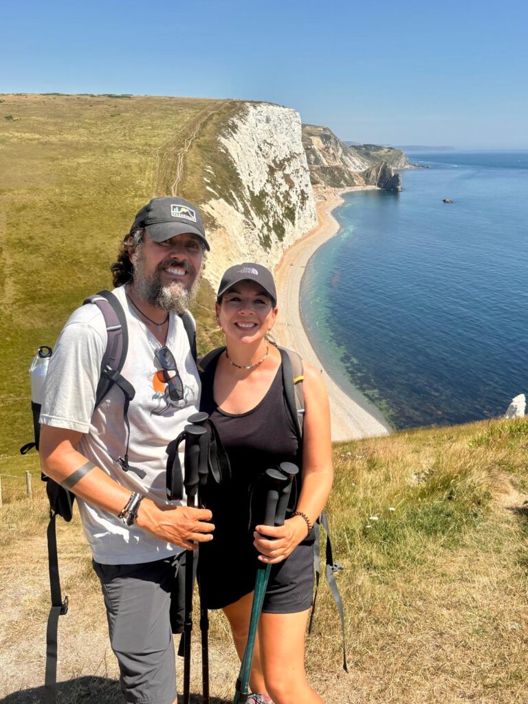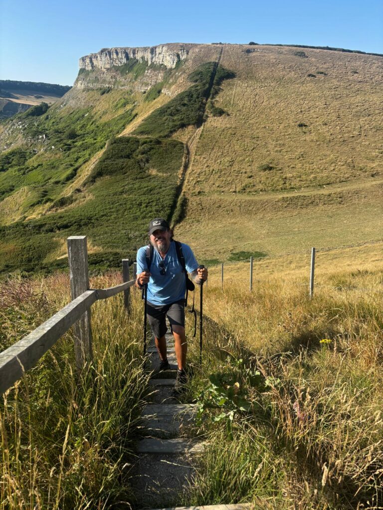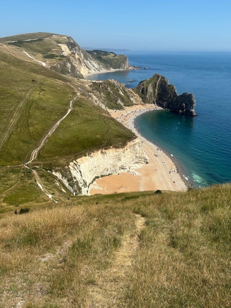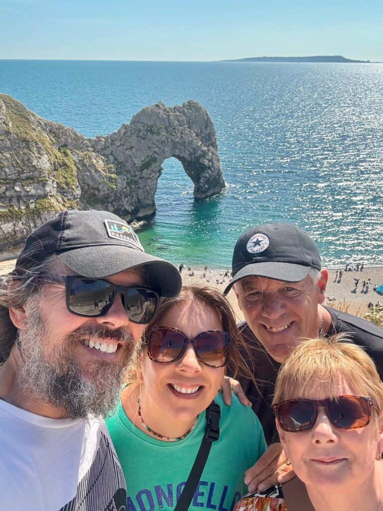 We weren’t done yet though – next on the agenda was a stop at Durdle Door. If you’ve never seen it, Durdle Door is an iconic natural limestone arch, created as the sea gradually eroded a hole through the rock. It’s one of the most photographed landmarks on the entire south coast and has been featured in music videos, films and even poetry. The walk down to the beach is steep and dramatic, but it’s the walk back up that really hits you – Pat might still be recovering from it now 😅. That said, the views were worth every step, stretching across the sea and back towards the Isle of Portland where we were just yesterday.