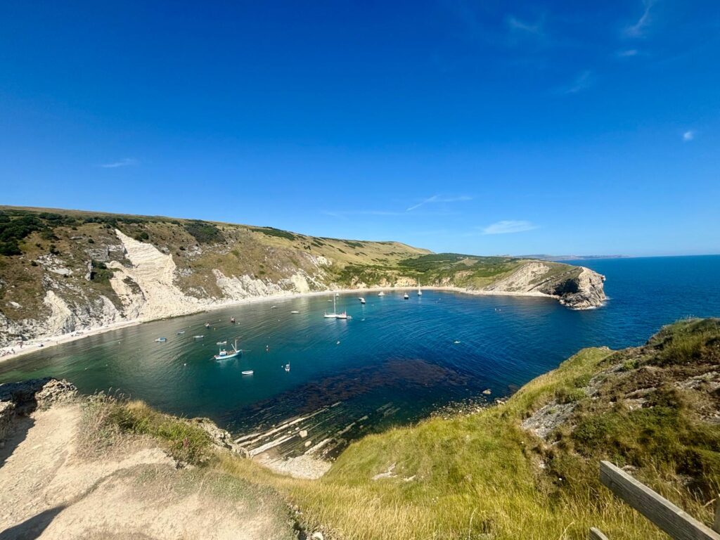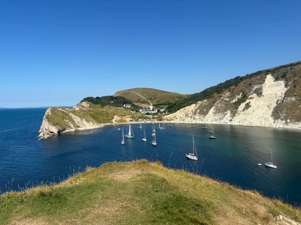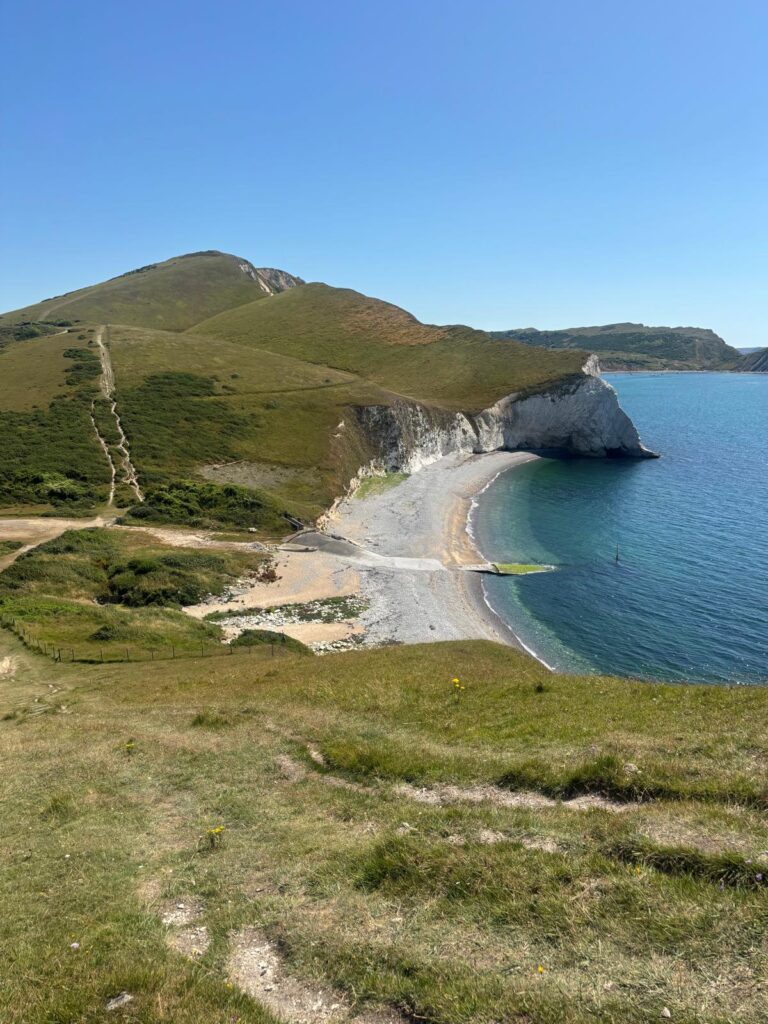 From there, we made our way to Lulworth Cove, where we’ll be stopping over tomorrow night during the walk. It’s a beautiful spot – a near-perfect circular bay formed over thousands of years by coastal erosion. The chalk cliffs and turquoise water make it feel almost Mediterranean, and while it was busy with summer visitors, the atmosphere was brilliant. The geology here is famous worldwide – part of the Jurassic Coast, a UNESCO World Heritage Site, and you can quite literally see millions of years of Earth’s history layered into the cliff face.