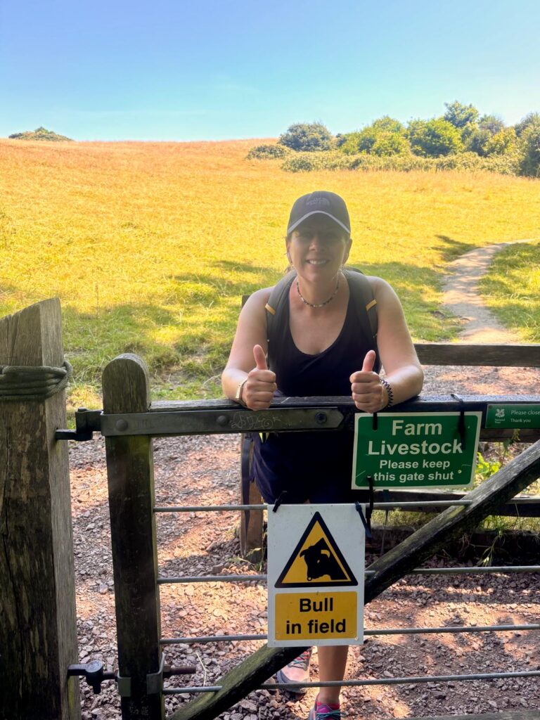 After a brief rest, we cracked on to tackle the first big climb of the day: White Nothe. This chalk headland rises around 450 feet above sea level and is known for its dramatic, sweeping views across the Jurassic Coast. The climb was relentless – it just seemed to keep going and going, with the sun blazing down the entire time. To make things even more exciting, the field we had to cross to start the ascent had a cheerful sign: “Bull in Field.” Let’s just say my pace quickened rather sharply at that point.