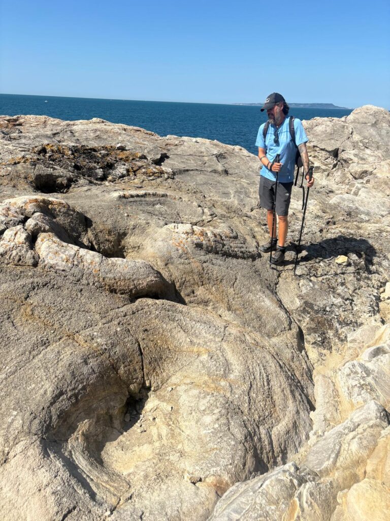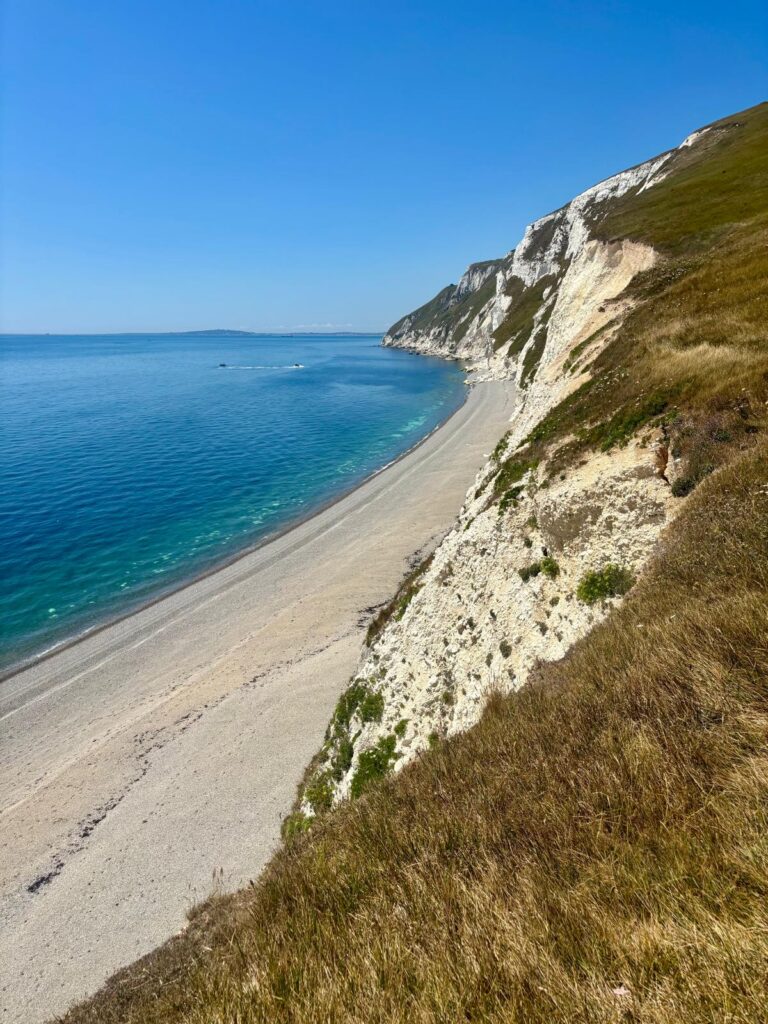 But once we reached the top, the view made it all worthwhile. We could see back across Weymouth, the Isle of Portland, and right along the coast we’ve been navigating for weeks now. Absolutely breathtaking – though we barely had time to enjoy it before the rollercoaster began again: steep descents (on some very narrow and rocky paths), then straight back up again… not once, not twice, but three more times. It was a proper slog in the heat, and we were drenched from head to toe.