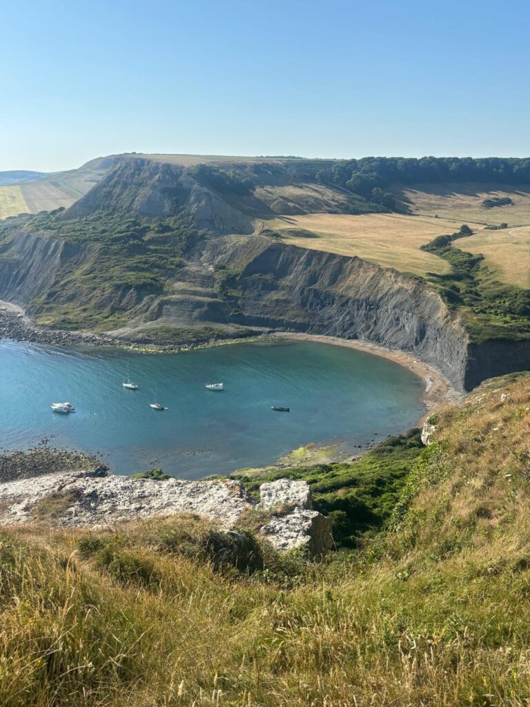 The walk began tough, straight out the gate. We had to trek across Lulworth Cove’s iconic pebble beach (gorgeous, but ankle-twisting), then navigate around a landslide before tackling the steep climb out of the cove itself. It’s a dramatic and beautiful place, formed over thousands of years by the sea breaching the limestone cliffs to reach softer clays behind. That erosion shaped the perfectly rounded cove we see today—a textbook example of coastal geomorphology and one of Dorset’s most photographed spots.