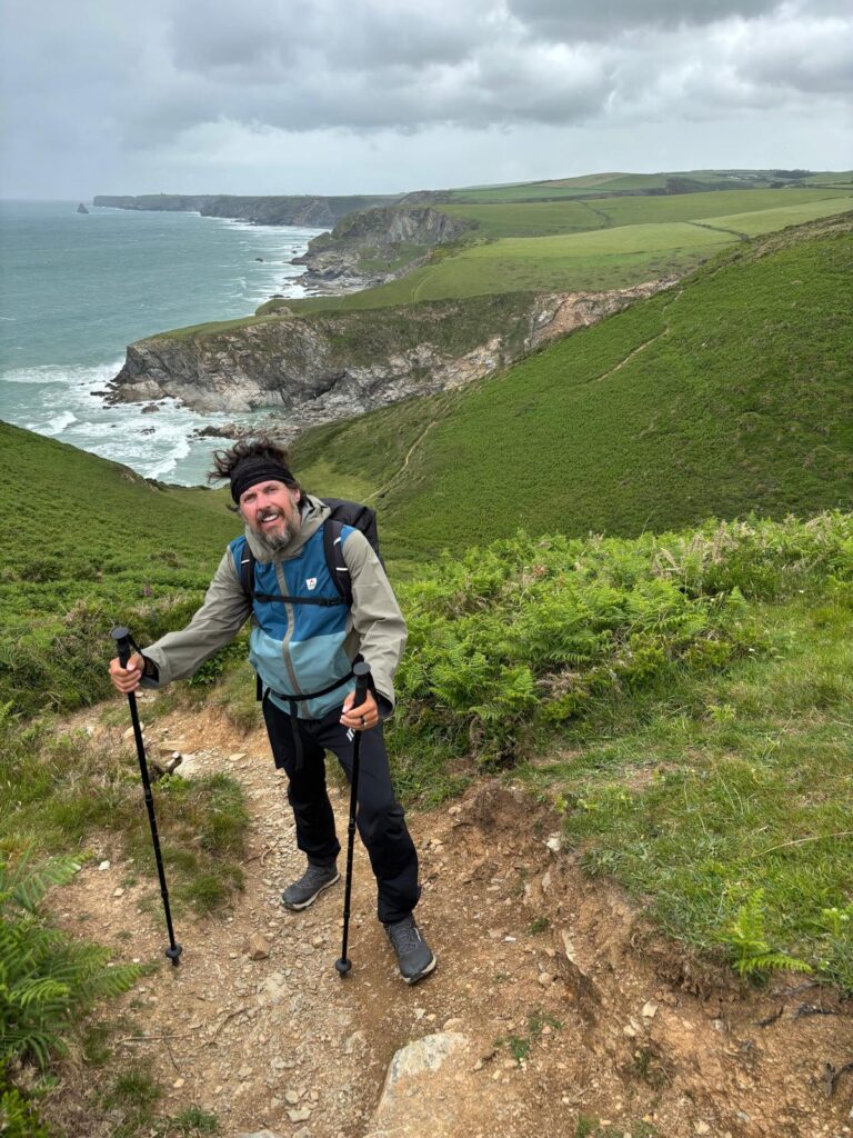 Every bend in the path revealed something new: jagged cliffs, sea stacks, and perhaps even the glimmer of Padstow in the distance – tomorrow’s goal, if the 45 mph winds and heavy rain don’t scupper our plans!