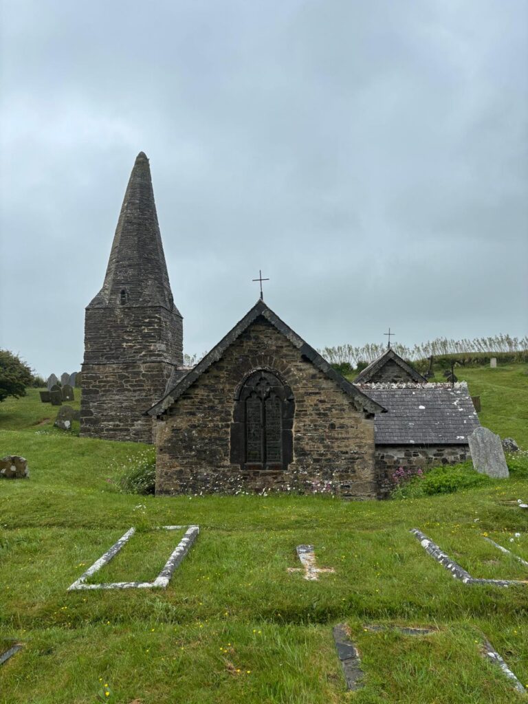We grabbed a pasty to go and pushed on. The wind was now full-on battering us, and although the rain eased for a bit, it came back with a vengeance—driving into our faces like tiny needles. We took brief shelter in St Enodoc church, then pushed on to Rock, where we caught the ferry across to Padstow.